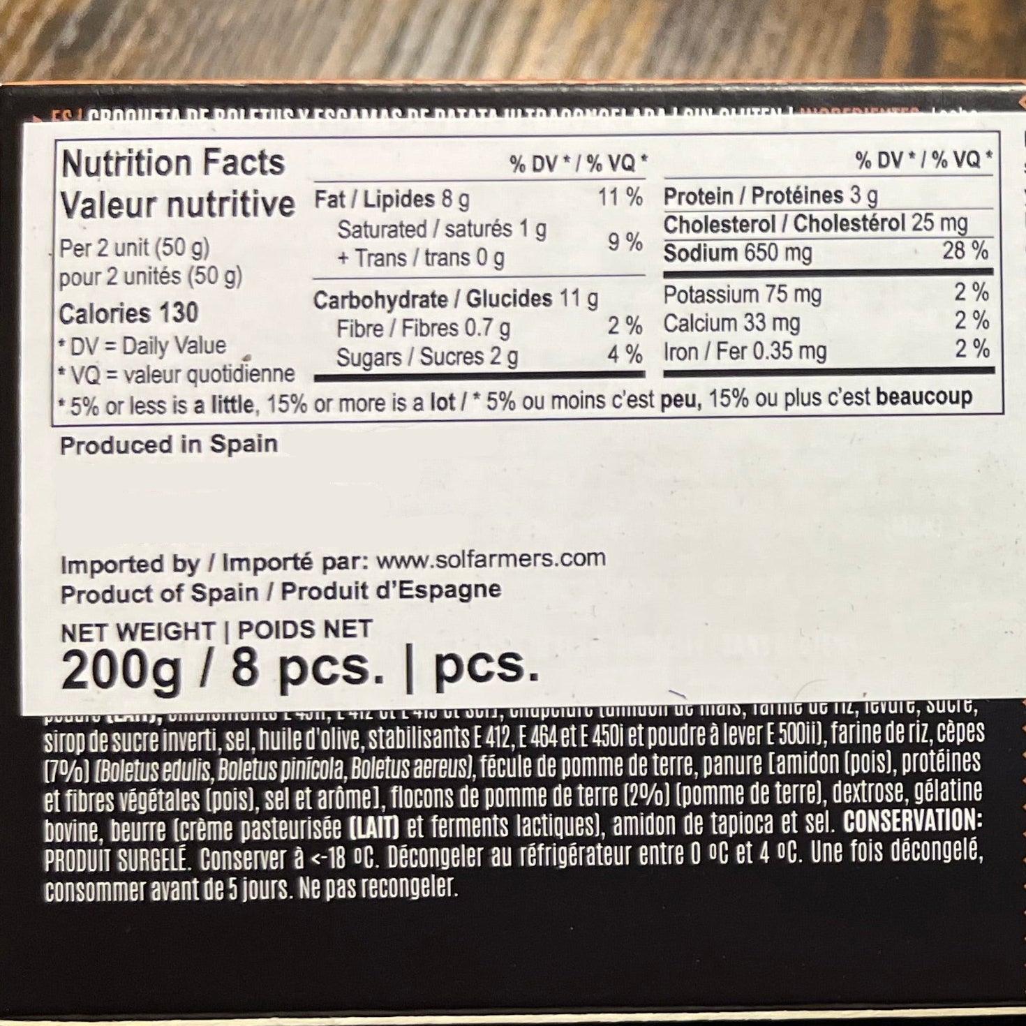 INGREDIENTS: Whole milk (MILK), sunflower oil, binding agent [water, starches (corn and potato) skimmed milk powder (MILK), emulsifiers (sodium triphosphate, guar gum and xanthan gum) and salt], breadcrumbs [corn starch, rice flour, yeast, sugar, invert sugar syrup, salt, olive oil, stabilizers guar gum, hydroxypropyl methylcellulose and diphosphates and raising agent (sodium carbonate) ], rice flour, boletus mushrooms (7%) (Boletus edulis, Boletus pinicola, Boletus aereus), potato starch, batter [pea starch, pea protein, pea fiber, salt, flavoring], potato flakes (2%) (potato), dextrose, bovine gelatin, butter (pasteurized cream (MILK), lactic ferments), tapioca starch, salt.